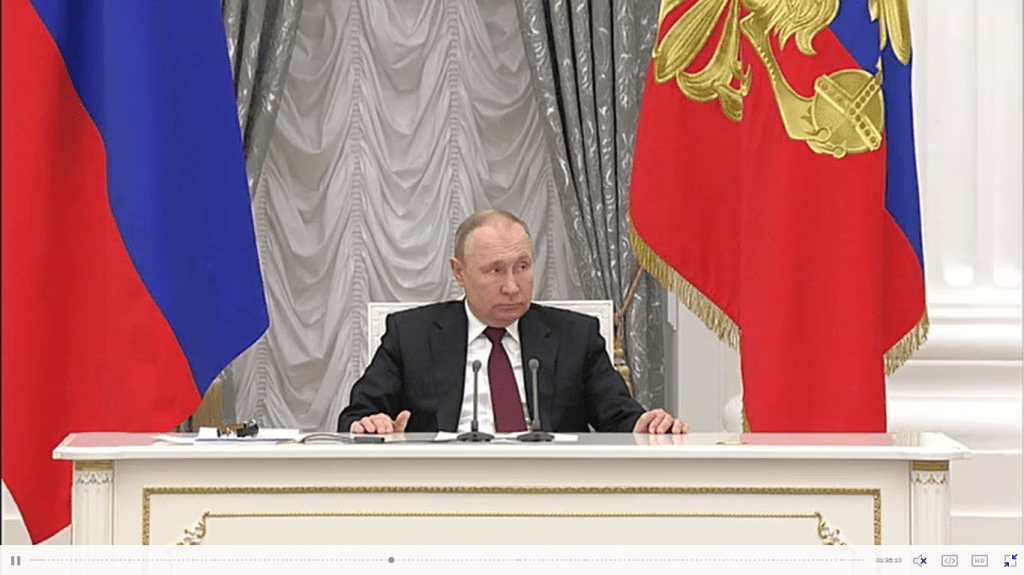Le président russe Vladimir Poutine, à la tête d’une réunion du Conseil de sécurité de la Fédération de Russie le 21 février 2022, au Kremlin, à Moscou.