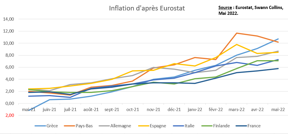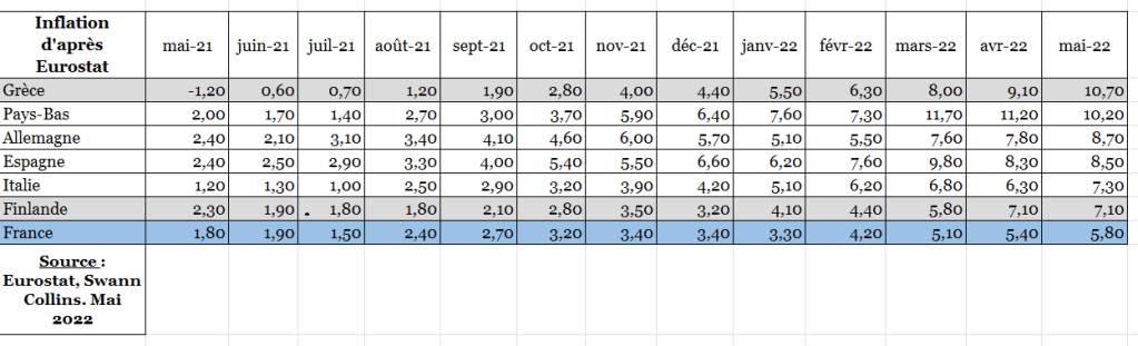 Sur un an, selon les données publiées par Eurostat, les prix à la consommation en France ont augmenté de 5,8 % en mai 2022, après +5,4% en avril et +5,1% en mars.