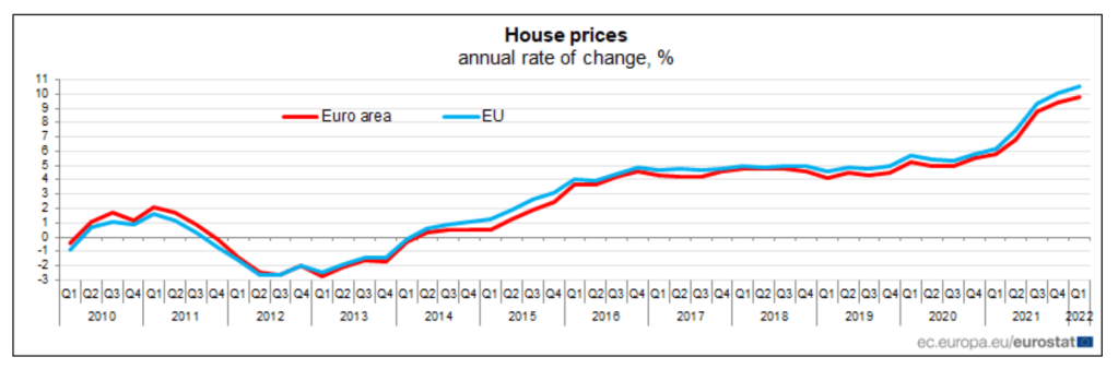 In the first quarter of 2022, house prices, as measured by the European House Price Index, rose by 9.8% in the euro area and by 10.5% in the European Union (27 countries) compared with the first quarter in 2021. This is the highest annual increase for the euro area since 2005 when house prices started to be collected, and since the fourth quarter of 2006 for the European Union, reported Eurostat, the European statistics agency.