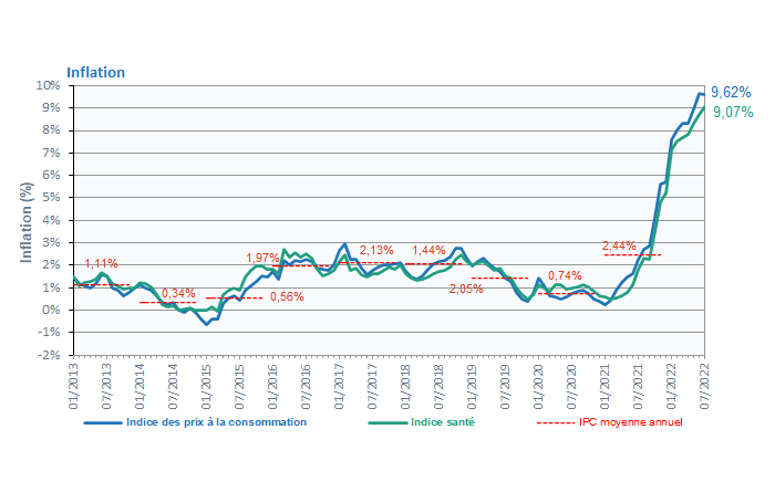 En juillet, L’inflation s’élevait à 9,62% contre 9,65% en juin et 8,97% en mai. Sur la base de l’indice santé, l’inflation s’élève ce mois-ci à 9,07% contre 8,72% en juin et 8,34% en mai. Le taux d’inflation hors produits énergétiques grimpe pour atteindre 5,76%, contre 5,26% en juin et 4,53% en mai.