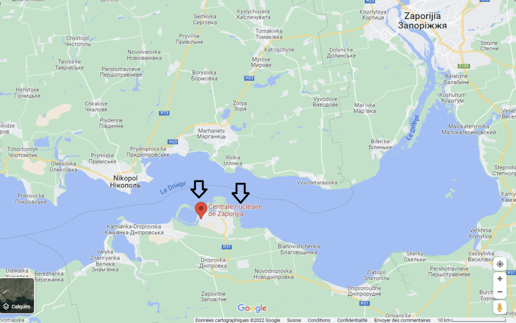 Carte de la région autour de la centrale nucléaire de Zaporozhye. La ville de Zaporozhye est au Nord-Est de la centrale, sur les rives du fleuve Dniepr. Les flèches indiquent le mouvement d’assaut de la flottille ukrainienne dans la nuit du 2 au 3 septembre 2022.