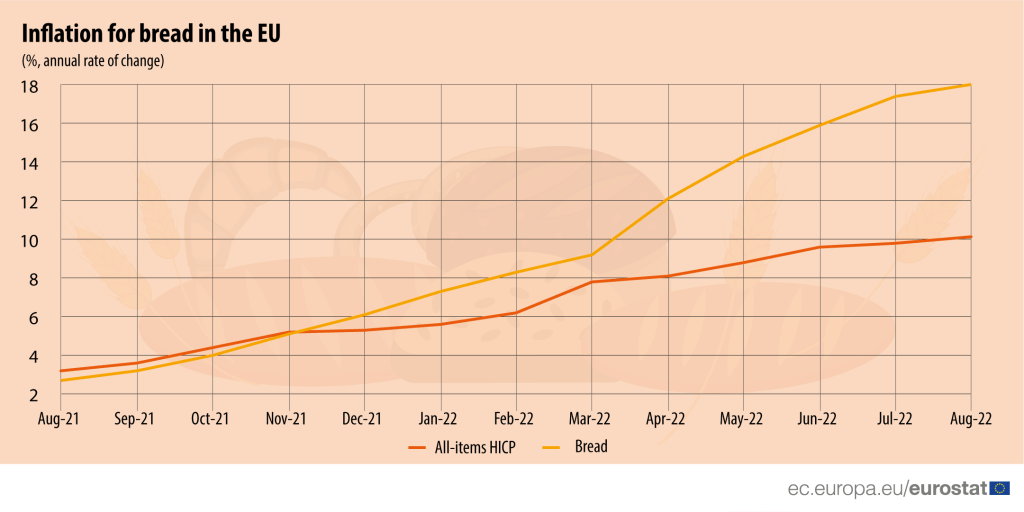 In August 2022, the price of bread in the European Union was on average 18% higher than in August 2021, according to Eurostat, the European statistics agency. This is a very strong increase compared to August 2021, when the price of bread was on average 3% higher than in August 2020. The monthly data also show a significant increase in headline inflation, although less significant (from +3% to +10%). This information comes from data on the Harmonised Index of Consumer Prices (HICP) recently published by Eurostat.