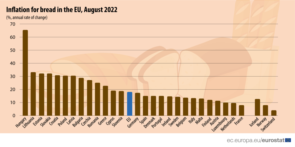 Some countries have been much more affected than others. The highest average rate of change in bread prices was recorded in Hungary (+66% in August 2022), followed by Lithuania (+33%), Estonia and Slovakia (+32% each).