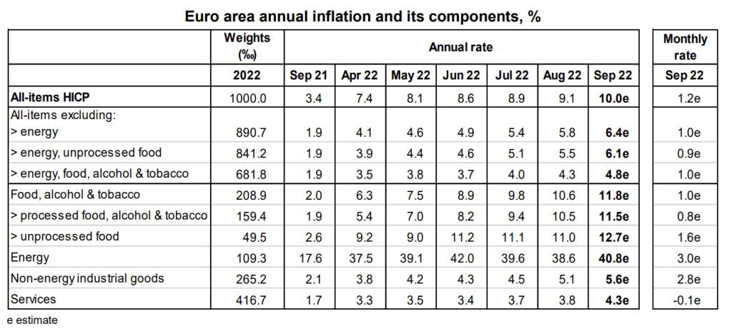Euro area annual inflation is expected to hit 10% in September 2022, up from 9.1% in August according to a flash estimate from Eurostat, the statistical office of the European Union.