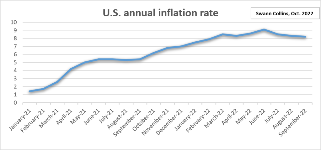 The all items index increased 8.2 percent for the 12 months ending September, a slightly smaller figure than the 8.3-percent increase for the period ending August. The all items less food and energy index rose 6.6 percent over the last 12 months. The energy index increased 19.8 percent for the 12 months ending September, a smaller increase than the 23.8-percent increase for the period ending August. The food index increased 11.2 percent over the last year.