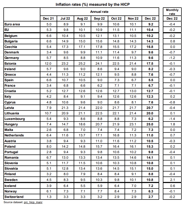 The euro area annual inflation rate was 9.2% in December 2022, down from 10.1% in November. A year earlier, the rate was 5.0%.