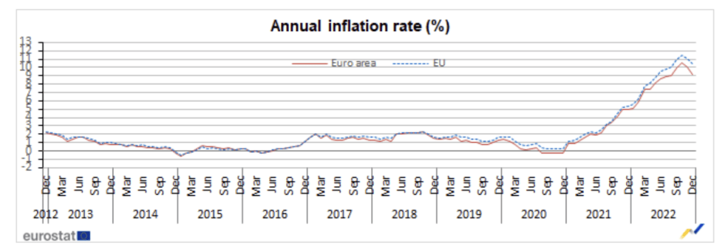 European Union annual inflation was 10.4% in December 2022, down from 11.1% in November. A year earlier, the rate was 5.3%. These figures were published today by Eurostat, the statistical office of the European Union.