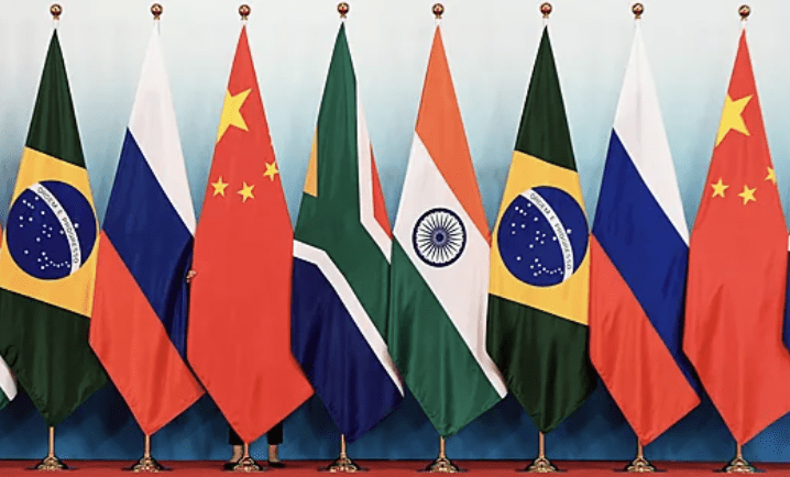 Photo : drapeaux des cinq Etats membres des BRICS (Brésil, Russie, Chine, Afrique du Sud et Inde).