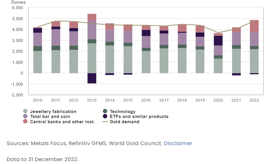 Brisk retail investment lifted gold bar and coin demand to a nine-year high. Strong growth in Europe, Turkey and the Middle East offset a sharp slowdown in China, where demand was affected throughout the year by COVID-related factors. High and persistent annual inflation in the Euro area (+8.5 percent in January 2023 and +9.2 percent in December 2022), European Union (+10.4% in December), Turkey (+64.3% in December), United Kingdom (+10.5% in December), Canada (+6.3% in December) and the United States (+6.5% in December) has fuelled the rise in gold prices.
