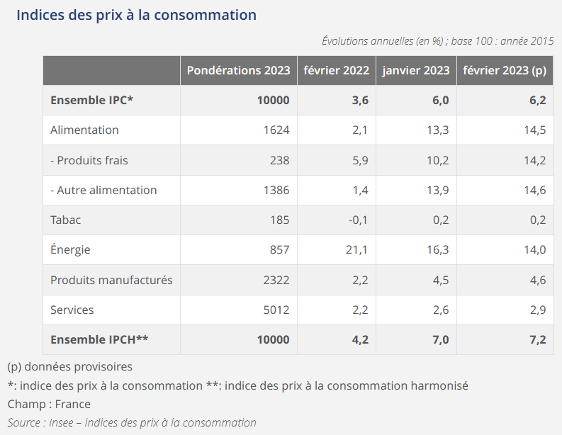Sur un an, selon l’estimation provisoire réalisée en fin de mois par l’INSEE, les prix à la consommation en France augmenteraient de 6,2 % en février 2023, après +6,0 % en janvier et +5.9% enregistré en décembre. Cette hausse de l’inflation serait due à l’accélération des prix de l’alimentation et des services. Les prix des produits manufacturés augmenteraient sur un an à un rythme proche du mois précédent et ceux de l’énergie ralentiraient.