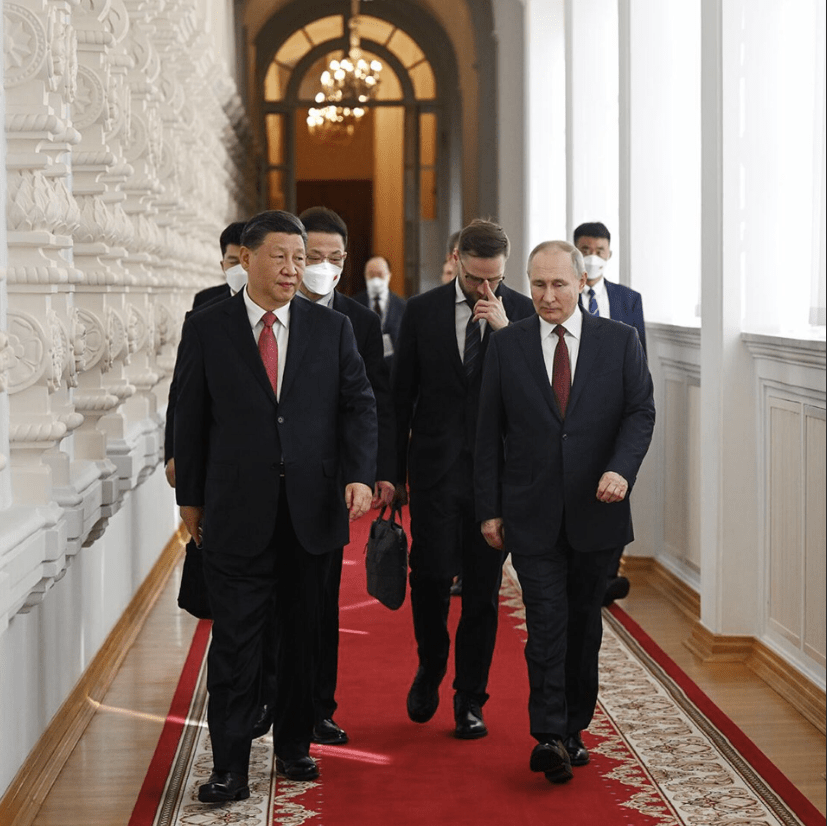 Photo: Chinese President Xi Jinping, left, walks alongside Russian President Vladimir Putin on March 21, 2023, into a Kremlin room to hold a working meeting.