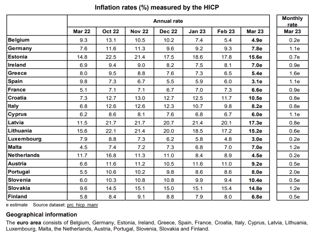Looking at the main components of euro area inflation, food, alcohol & tobacco is expected to have the highestannual rate in March (15.4%, compared with 15.0% in February), followed by non-energy industrial goods (6.6%, compared with 6.8% in February), services (5.0%, compared with 4.8% in February) and energy (-0.9%, compared with 13.7% in February).