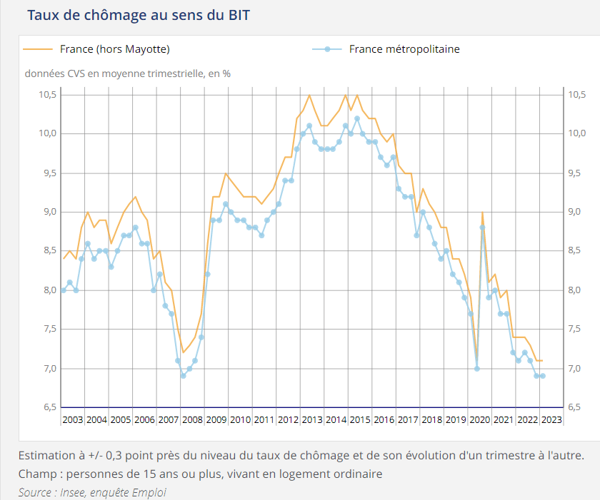 Le taux de chômage au sens du BIT est ainsi stable à 7,1 % de la population active en France (hors Mayotte), l’estimation du quatrième trimestre 2022 étant très légèrement abaissée. Le taux de chômage est ainsi inférieur de 0,3 point à son niveau du premier trimestre 2022 et de 3,4 points à son pic de mi-2015. Il s’agit de son plus bas niveau depuis le deuxième trimestre 2020, alors qu’il avait ponctuellement fortement baissé en « trompe-l’œil » pendant le premier confinement. Des niveaux équivalents ont été mesurés au premier trimestre 2008 (7,2 %) et au deuxième trimestre 1982 (7,1 %).
