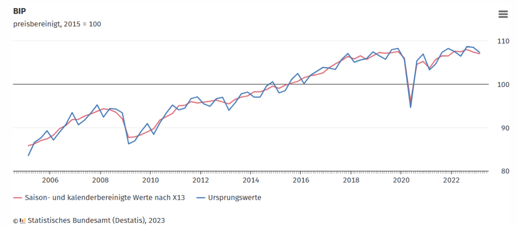 Le produit intérieur brut (PIB) allemand a chuté de 0,3% au premier trimestre 2023 (corrigé des prix, des variations saisonnières et calendaires). La baisse était de 0,2 % par rapport au même trimestre un an plus tôt (corrigée des prix).