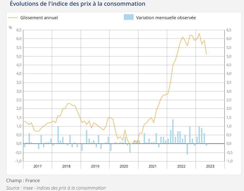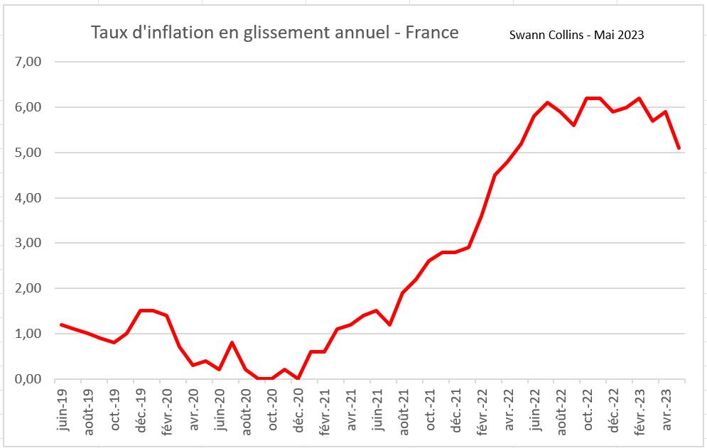 Sur un an, selon l’estimation provisoire réalisée par l’INSEE en fin de mois, les prix à la consommation augmenteraient de 5,1 % en mai 2023, après +5,9 % en avril. Cette baisse de l’inflation après des mois de hausse serait due au ralentissement sur un an des prix de l’énergie, de l’alimentation, des produits manufacturés et des services. Les prix du tabac accéléreraient pour le troisième mois consécutif.