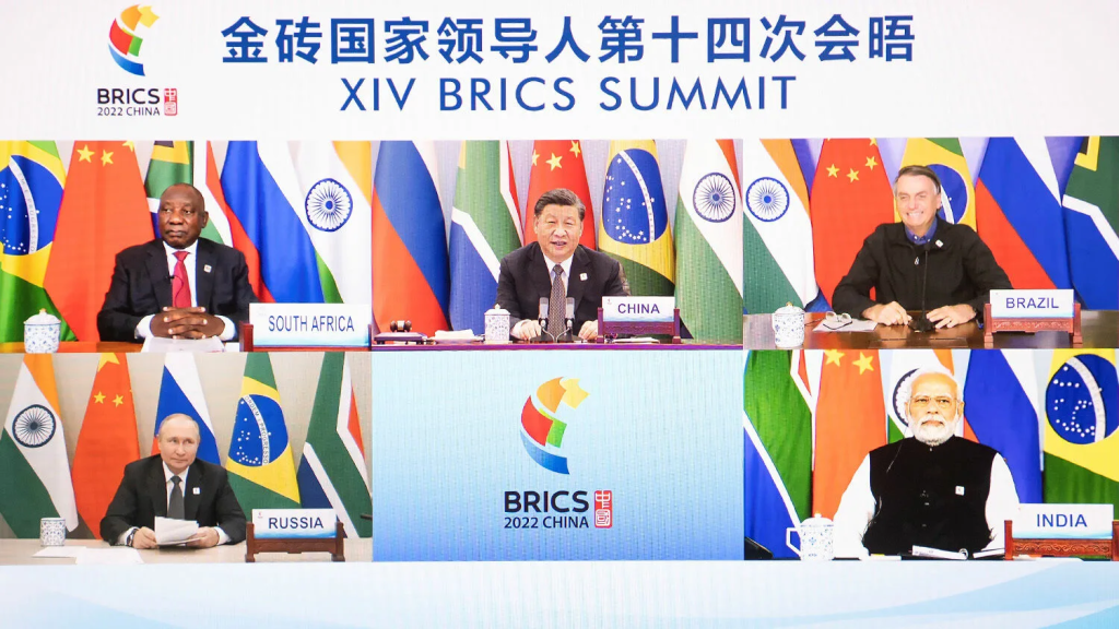 Photo : Image du XIVe sommet des BRICS le 22 juin 2022, avec les dirigeants des cinq Etats membres (Brésil, Russie, Inde, Chine et Afrique du Sud).