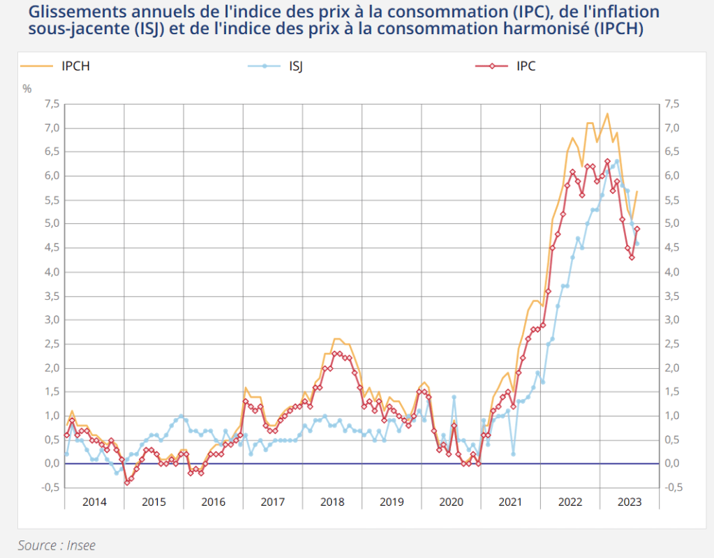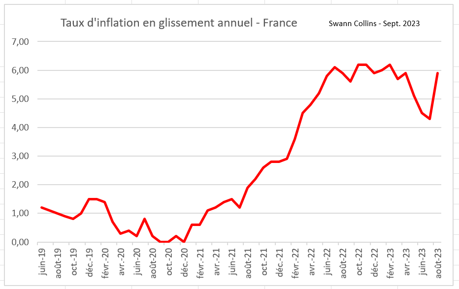 En août 2023, l’indice des prix à la consommation (IPC) en France augmente de 1,0 % sur un mois, après +0,1 % en juillet, pour atteindre +5,9%.