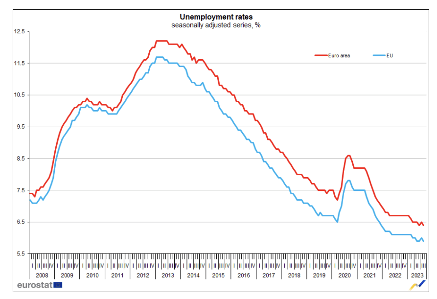 In August 2023, the euro area seasonally-adjusted unemployment rate was 6.4%, down from 6.5% in July 2023 and down from 6.7% in August 2022.