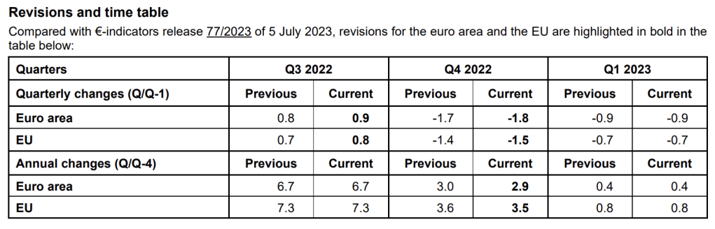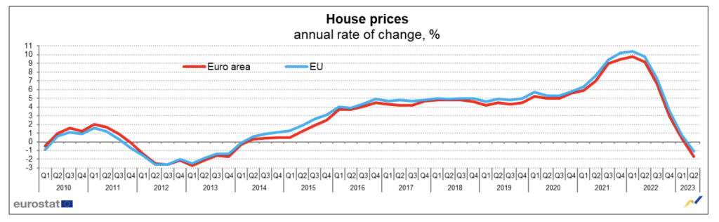 This suggests that the housing market in the Euro area and the EU is experiencing some volatility, with prices falling in the second quarter of 2023 but increasing in the first quarter of the same year.
