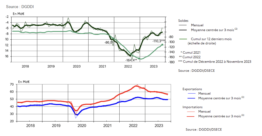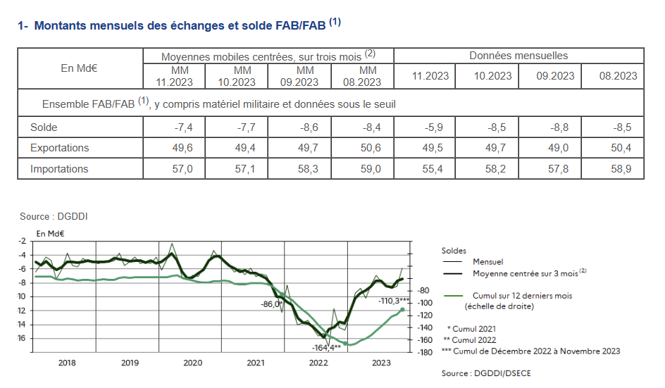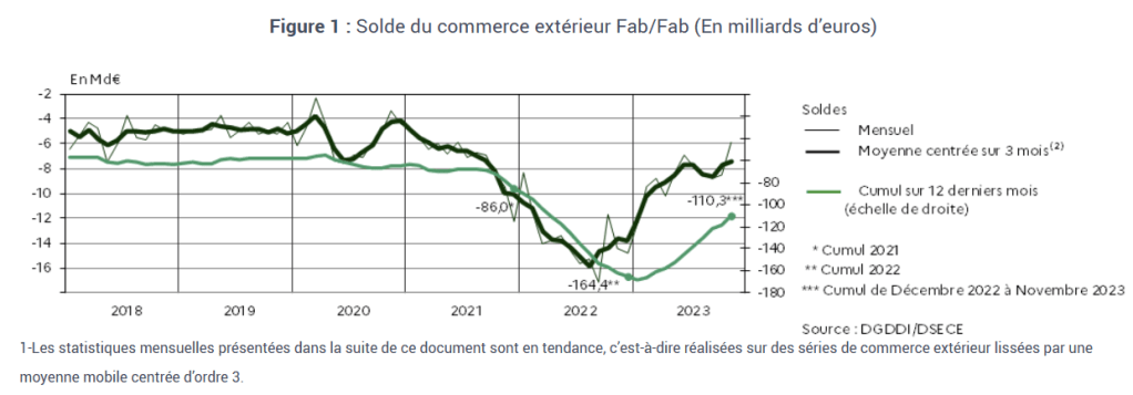 Depuis le mois de février 2023, le solde commercial cumulé sur 12 mois s’améliore, et atteint – 110,3 Md€ en novembre 2023 d’après les chiffres publiés par les douanes françaises.