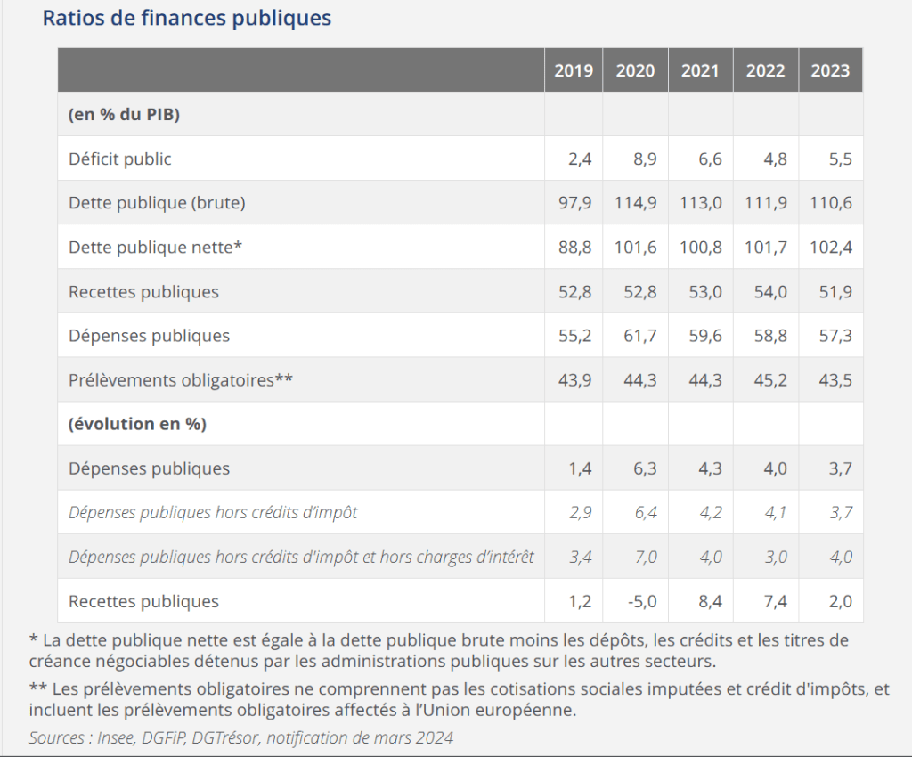 La dette des administrations publiques au sens de Maastricht atteint 110,6 % du PIB fin 2023 après 111,9 % fin 2022 ; elle était de 97,9 % du PIB en 2019.