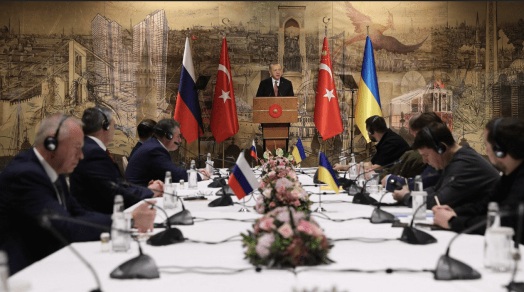 En mars et avril 2022, plusieurs cycles de négociations russo-ukrainiennes ont eu lieu à Istanbul. Le ministre russe des Affaires étrangères, Sergueï Lavrov, a déclaré que les projets d’accords reçus de Kiev après les pourparlers différaient des propositions présentées lors des réunions. Selon le ministre russe, l’Ukraine s’était engagée à accepter que les garanties de sécurité ne s’appliquent pas à la Crimée, mais cette clause n’a pas été incluse dans la nouvelle version de l’accord. Le 30 mars, le président ukrainien Volodymyr Zelensky avait eu une conversation téléphonique d’une heure avec le président américain Joe Biden.