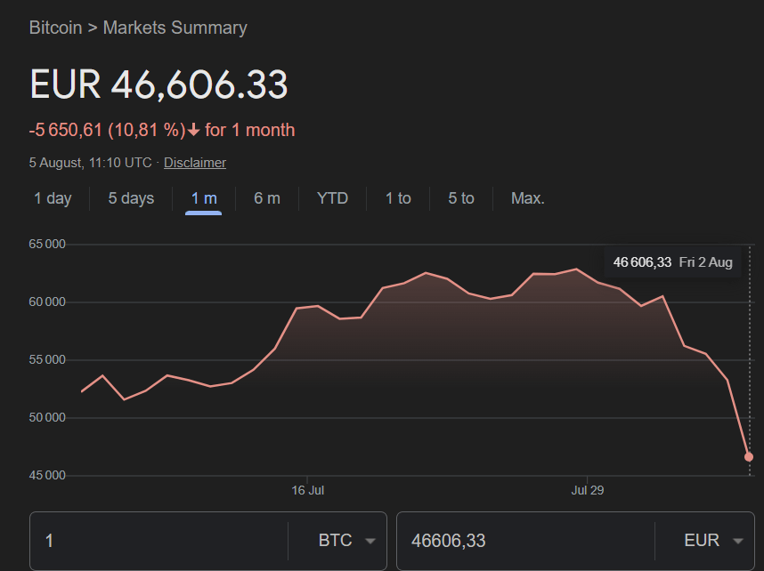 Bitcoin price is now at 46 606 EUR, at 01:14 PM Paris time.
