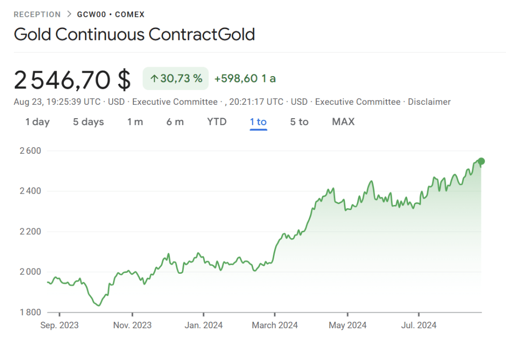 On August 9, gold price was at $ 2,428 per troy ounce at 08:43 AM New York Time. Now, on August 23, gold price is at $ 2,511 per troy ounce at 04:43 PM NY TIME. It is a + $25.7 gain over the day.