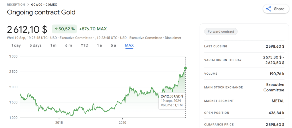 Gold price surged, hit $ 2,612 per troy ounce after the announce of the Fed cut. This marked a continuation of a robust upward trend for gold, which has seen prices increase over 25% this year due to various factors, including strong demand from central banks and investors seeking safe-haven assets amidst economic uncertainty.