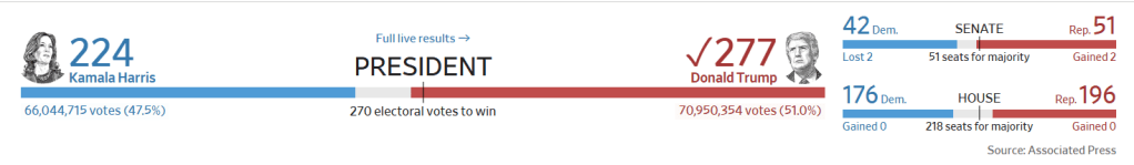 Electoral College Victory: Trump secured at least 277 electoral votes, significantly surpassing the 270 needed for victory, while Harris trailed with around 224 votes as of the latest counts.