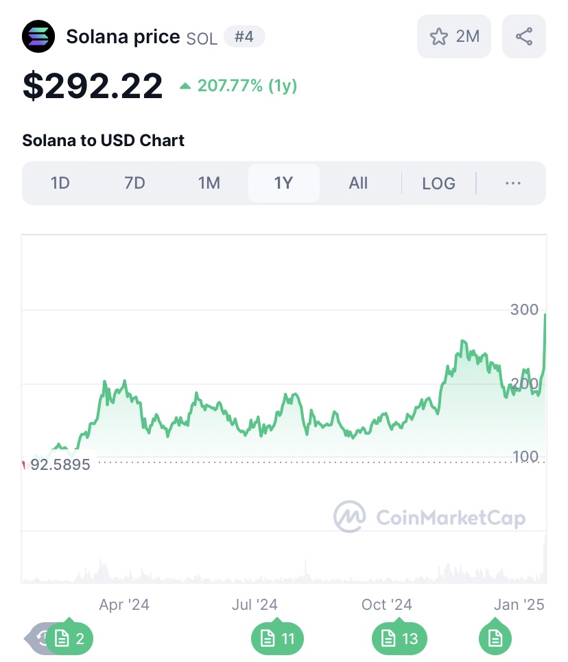 Solana (SOL) has reached a record high of $275 then $292, driven by the launch of the official TRUMP memecoin on its blockchain.