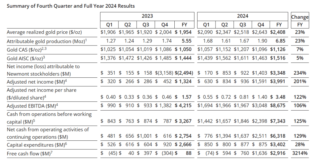Net Income: Newmont reported a net income of $3.4 billion over 2024, a significant increase from a $2.5 billion net loss in 2023.