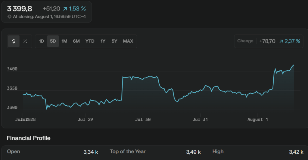 Earlier in the week on August 1, gold rose to about $3,362.51 per ounce, representing a daily gain of around 2.25% from the previous day, and hovered near the $3,350-$3,400 level through the week.